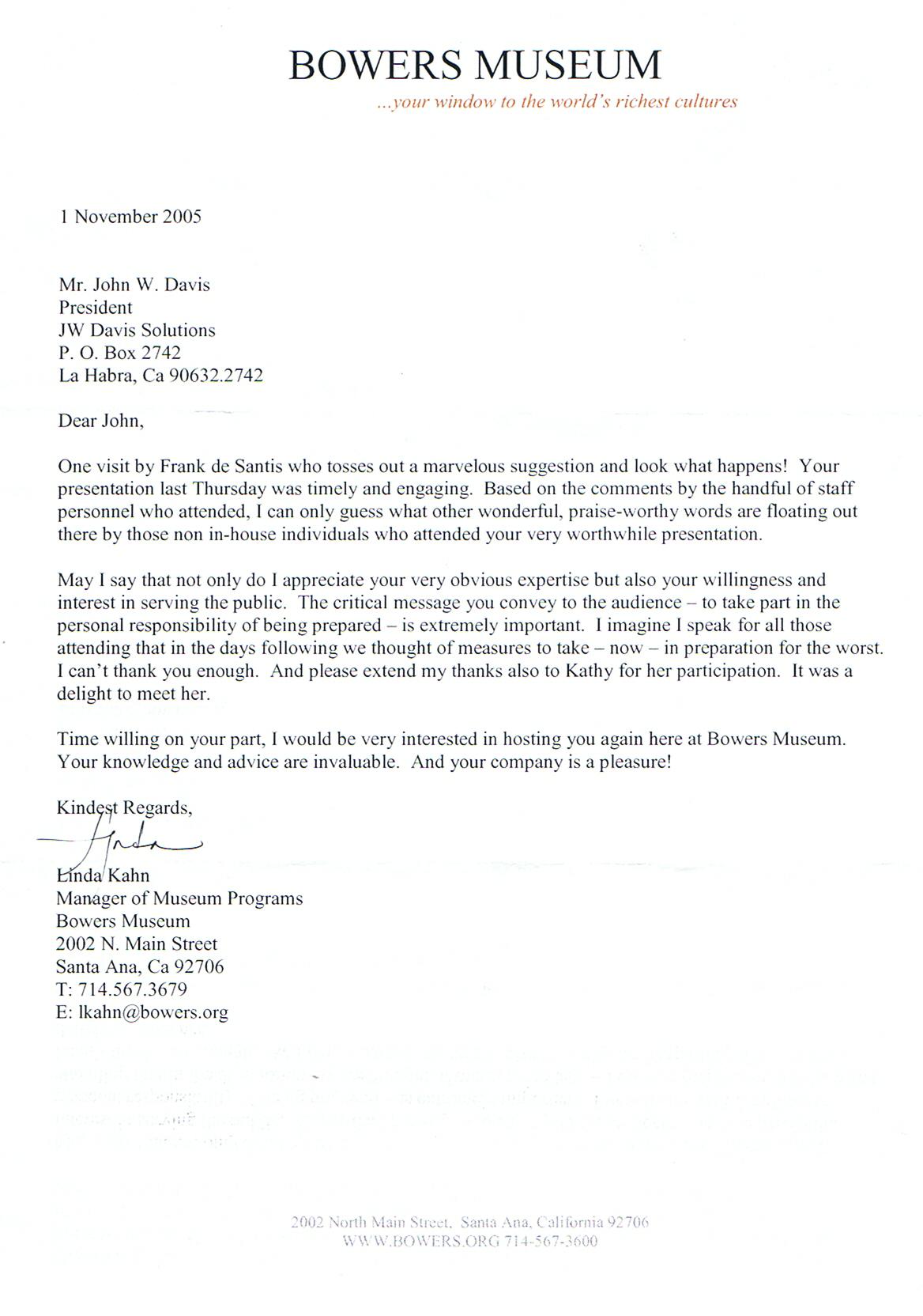 Letter from Lind Kahn, Manager of Museum Programs, Bowers Museum